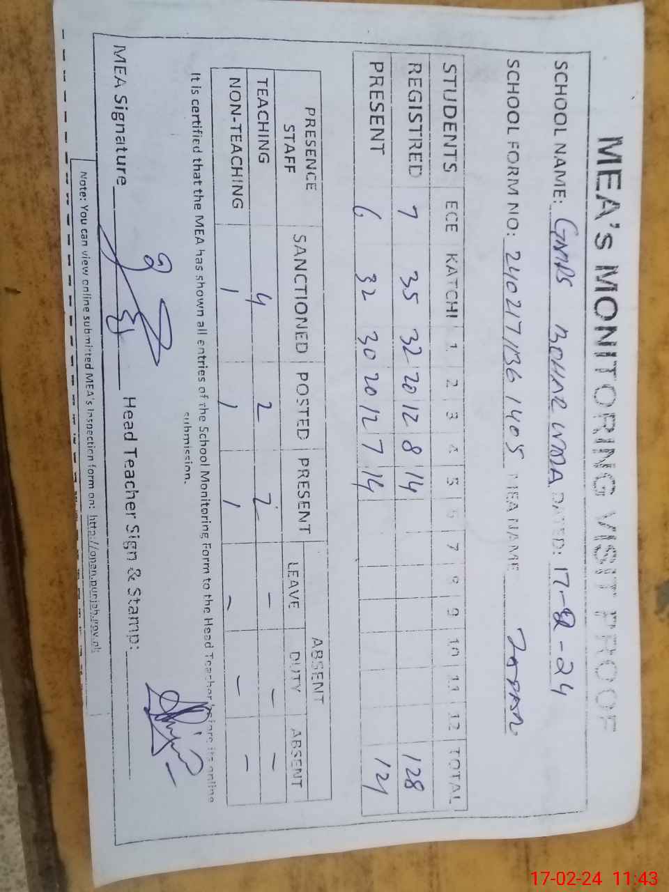 | Attendance Register | Head Teacher | MEA with School | Visit Proof |