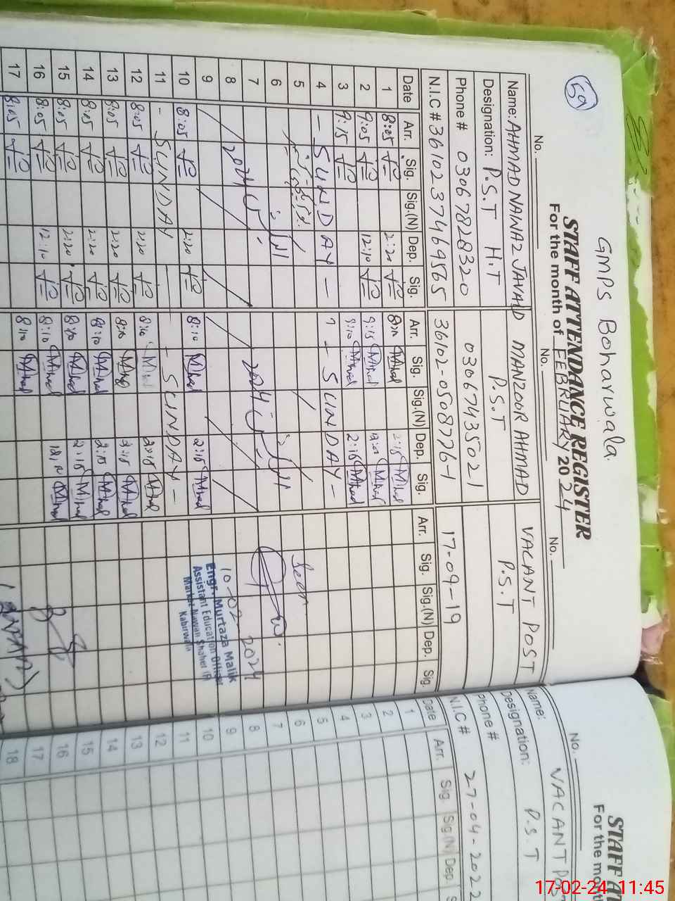| CNIC | Full Name | Designation | R/C | Absence During Last Calender Month |