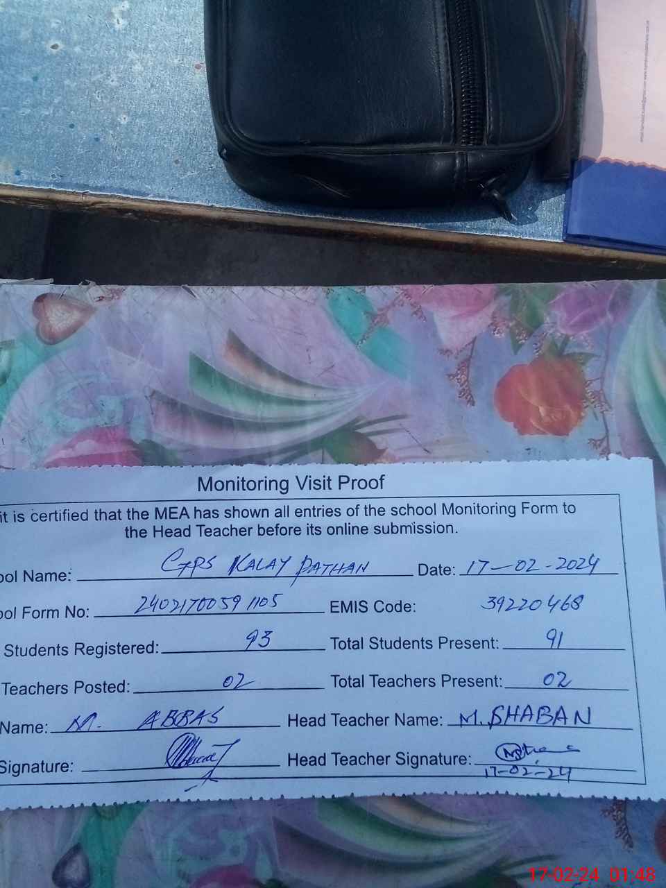 | Attendance Register | Head Teacher | MEA with School | Visit Proof |