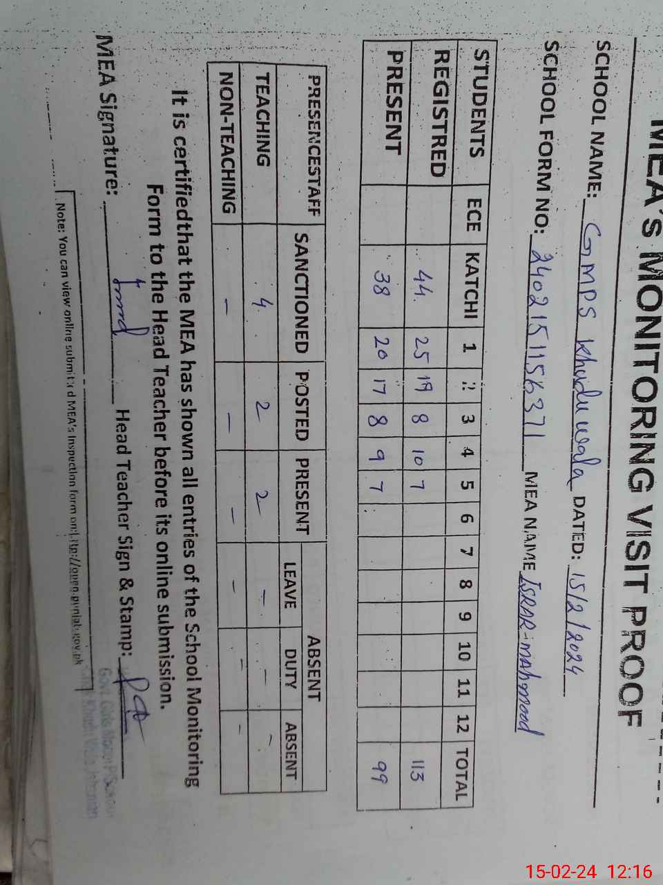 | Certified that this School was Inspected by the Undersigned MEA/DMO Today and the Information Stated Above is as Per Record. | |||||
