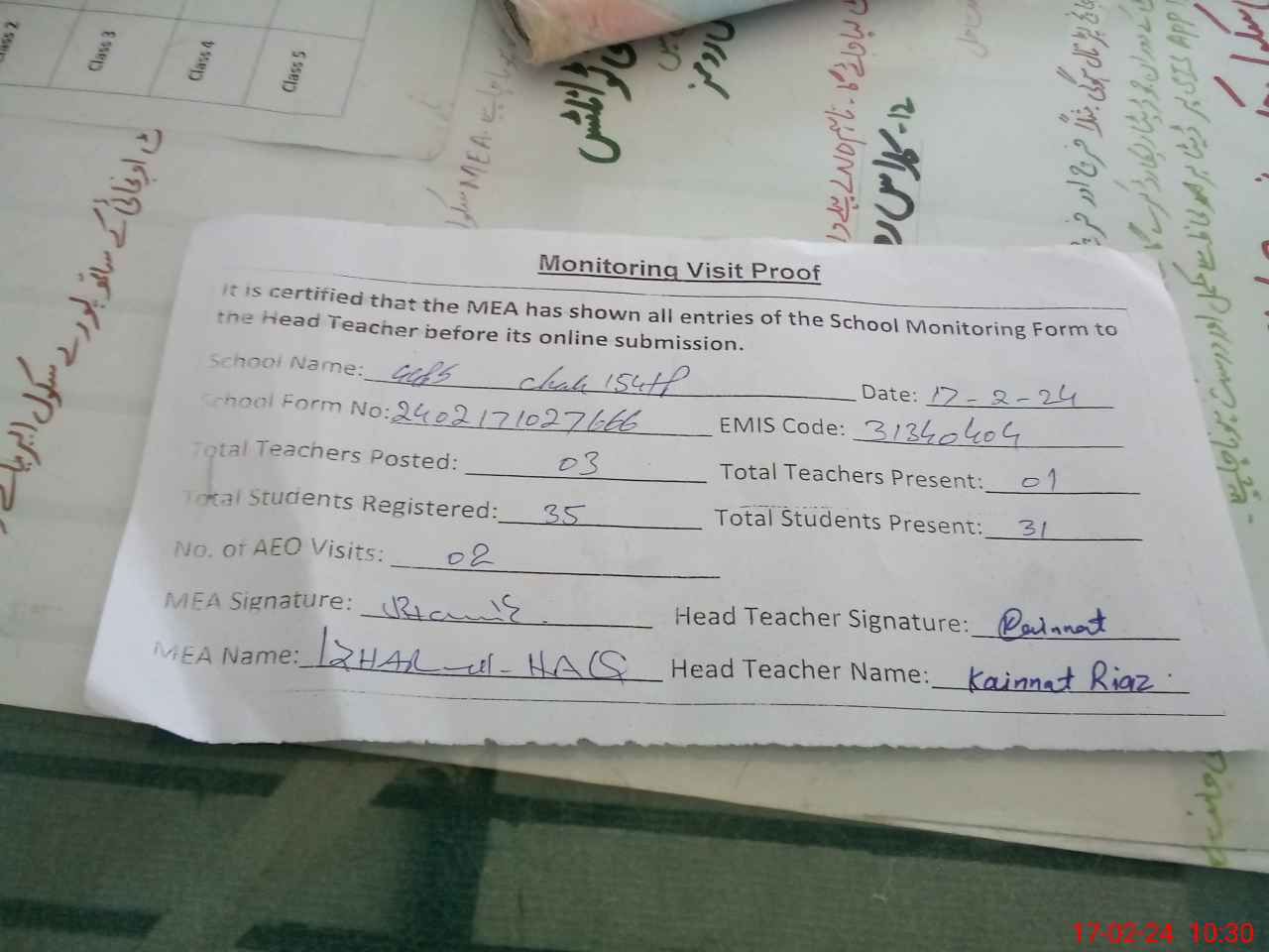 | Attendance Register | Head Teacher | MEA with School | Visit Proof |