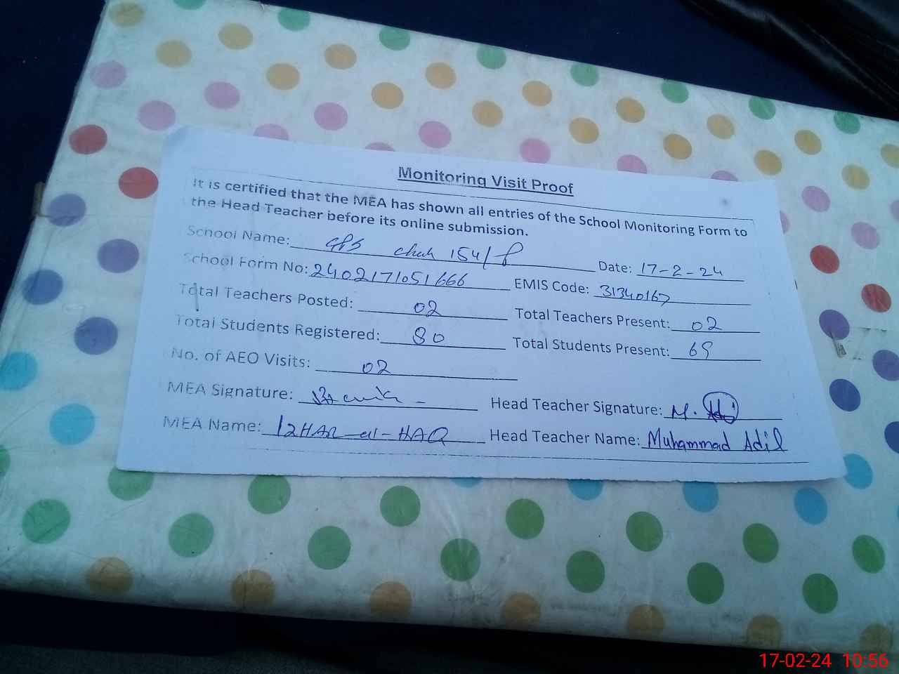 | EMIS Code: 31340167 | Name of School: GPS CHAK NO 154/P | |||