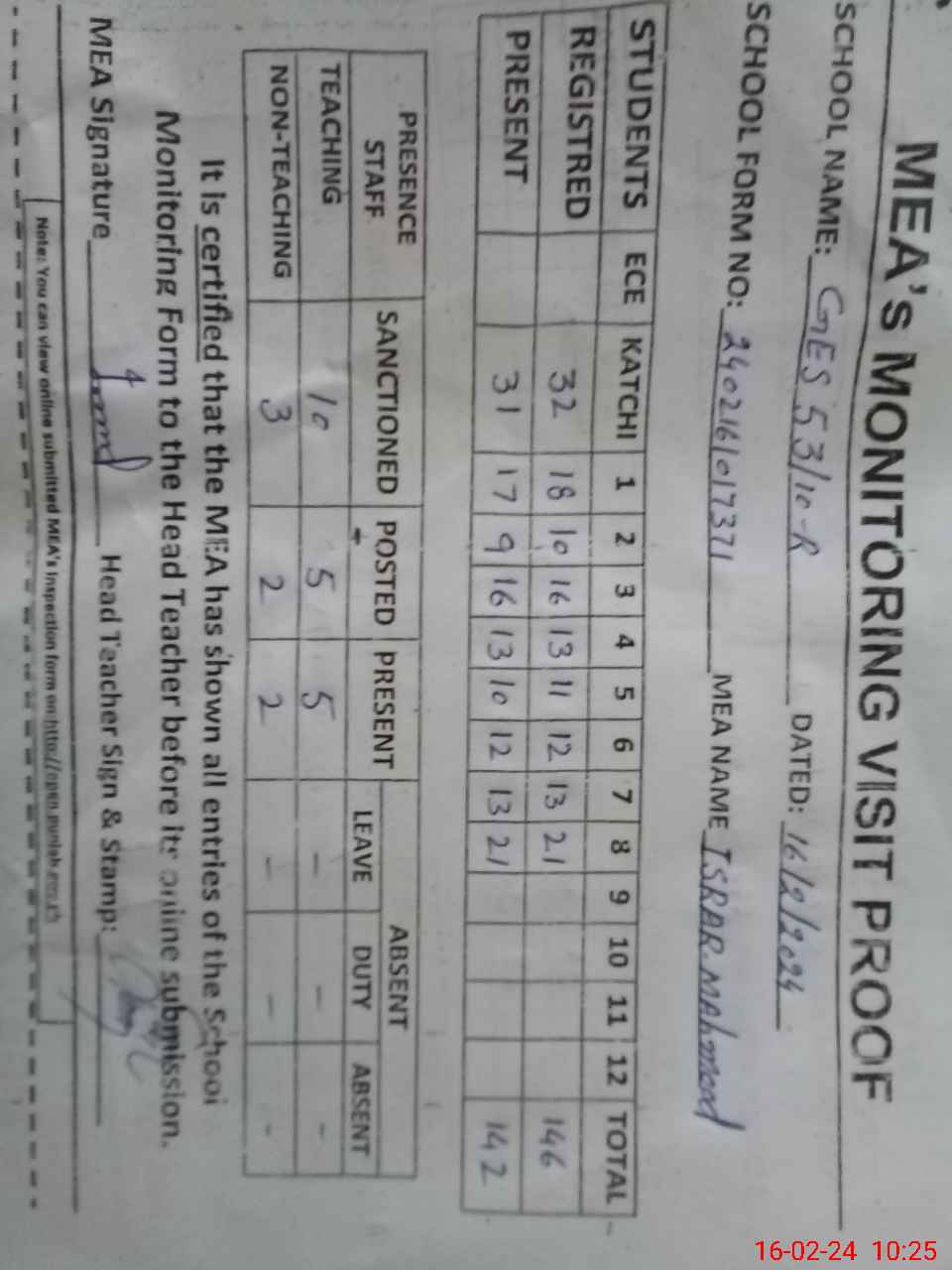 | Attendance Register | Head Teacher | MEA with School | Visit Proof |