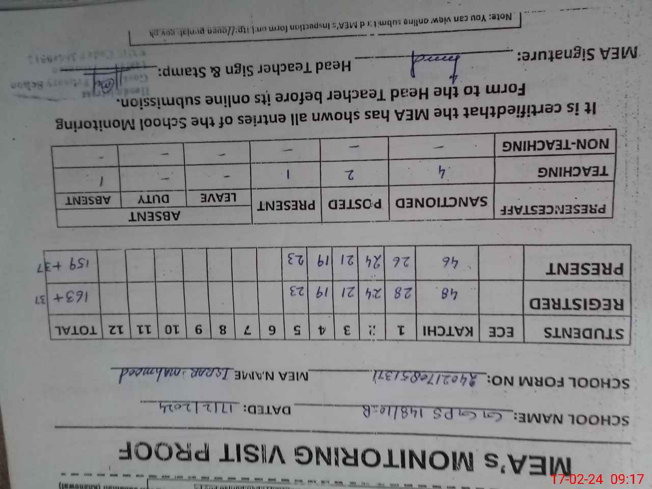 | Attendance Register | Head Teacher | MEA with School | Visit Proof |