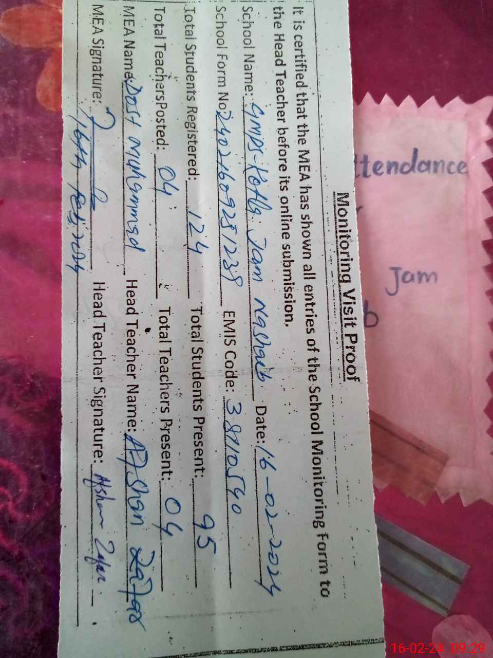 | Attendance Register | Head Teacher | MEA with School | Visit Proof |
