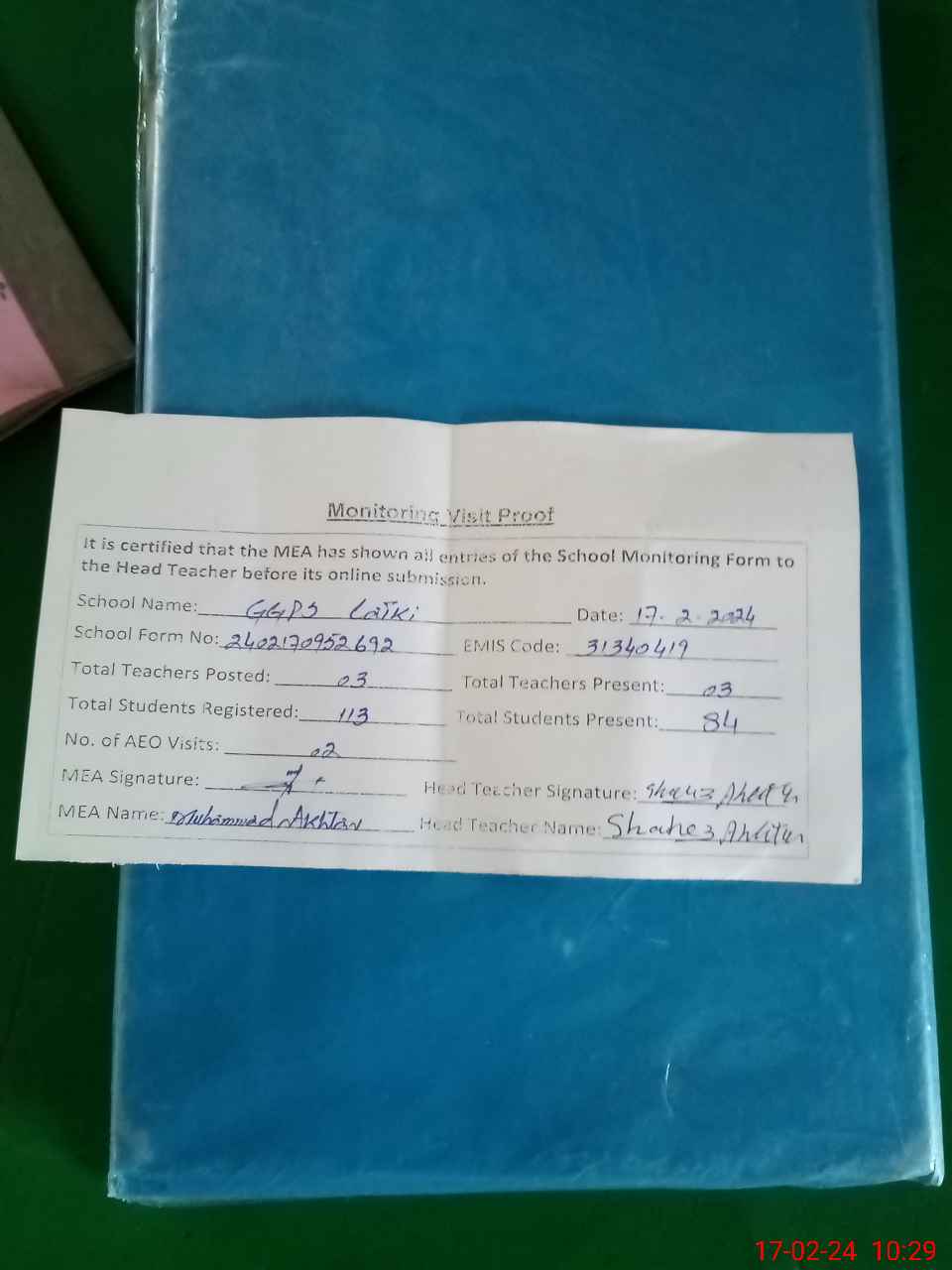 | Certified that this School was Inspected by the Undersigned MEA/DMO Today and the Information Stated Above is as Per Record. | |||||