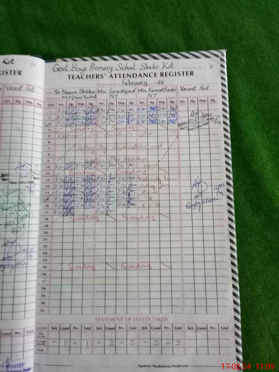 | Remarks (Use Separate Page if Required): Teacher kanwal Bashir has per register shown Maternity leave but section leave not available in school at time of visit mea Mark Absent | |||||