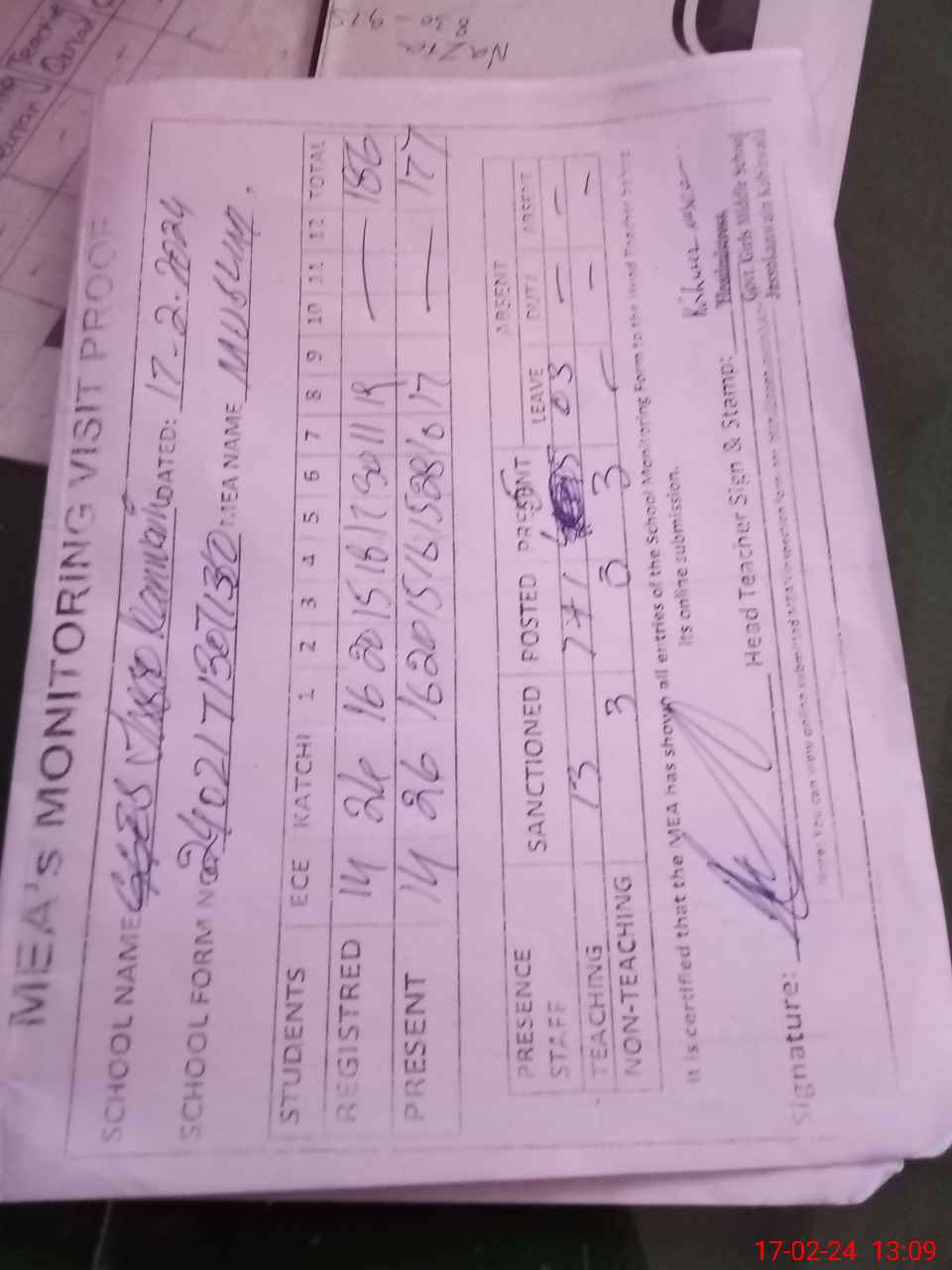 | Attendance Register | Head Teacher | MEA with School | Visit Proof |