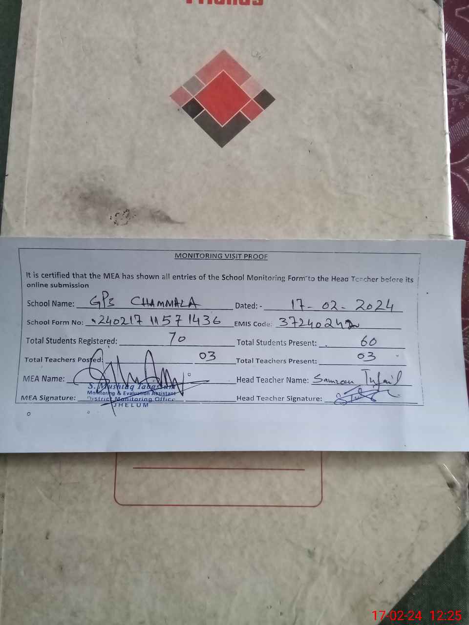 | EMIS Code: 37240242 | Name of School: GPS CHAMMALA | |||