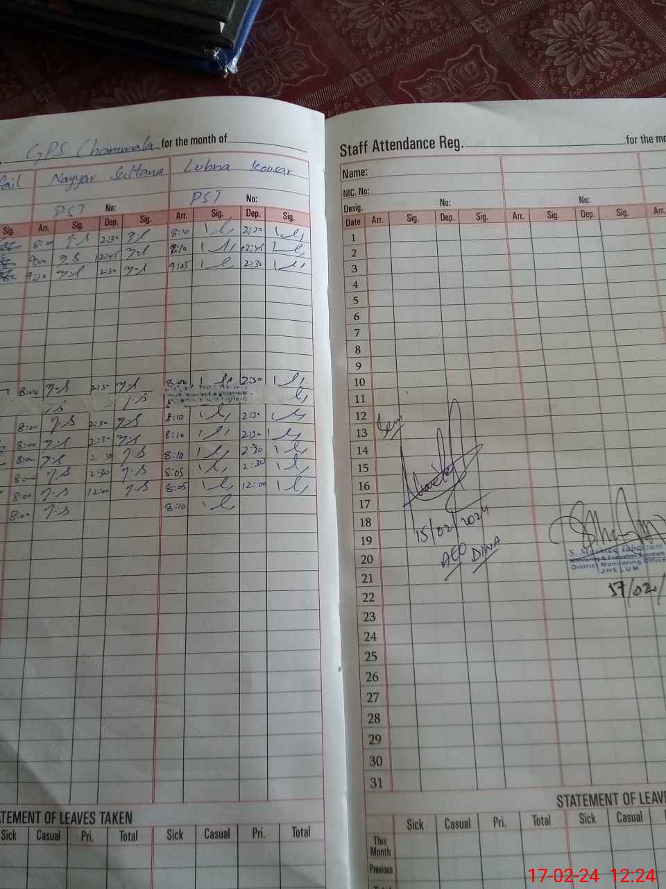| CNIC | Full Name | Designation | R/C | Absence During Last Calender Month |