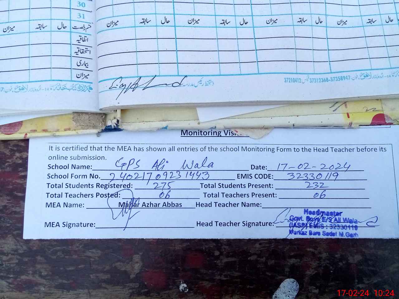 | EMIS Code: 32330119 | Name of School: GPS ALI WALA | |||
