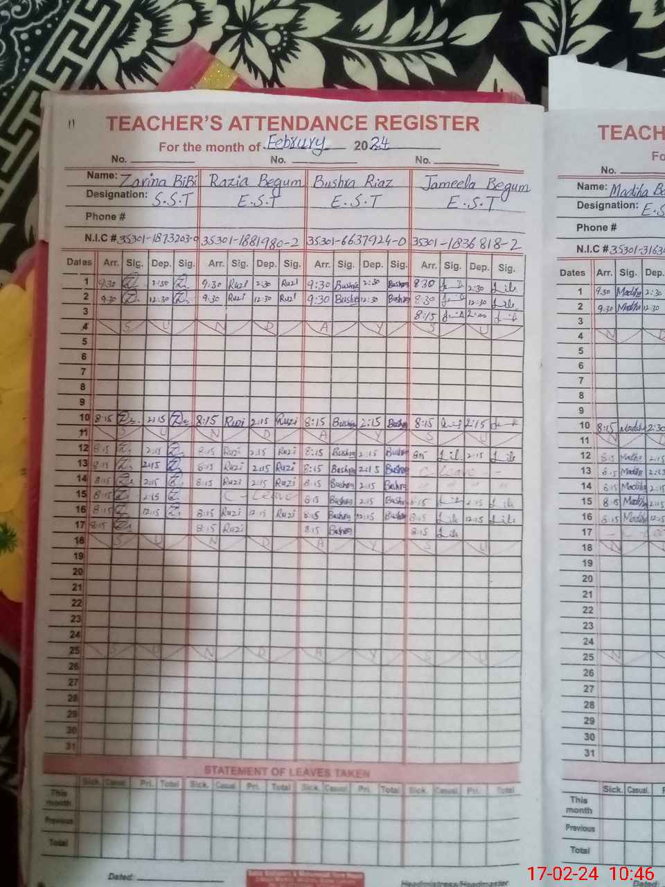 | CNIC | Full Name | Designation | R/C | Absence During Last Calender Month |