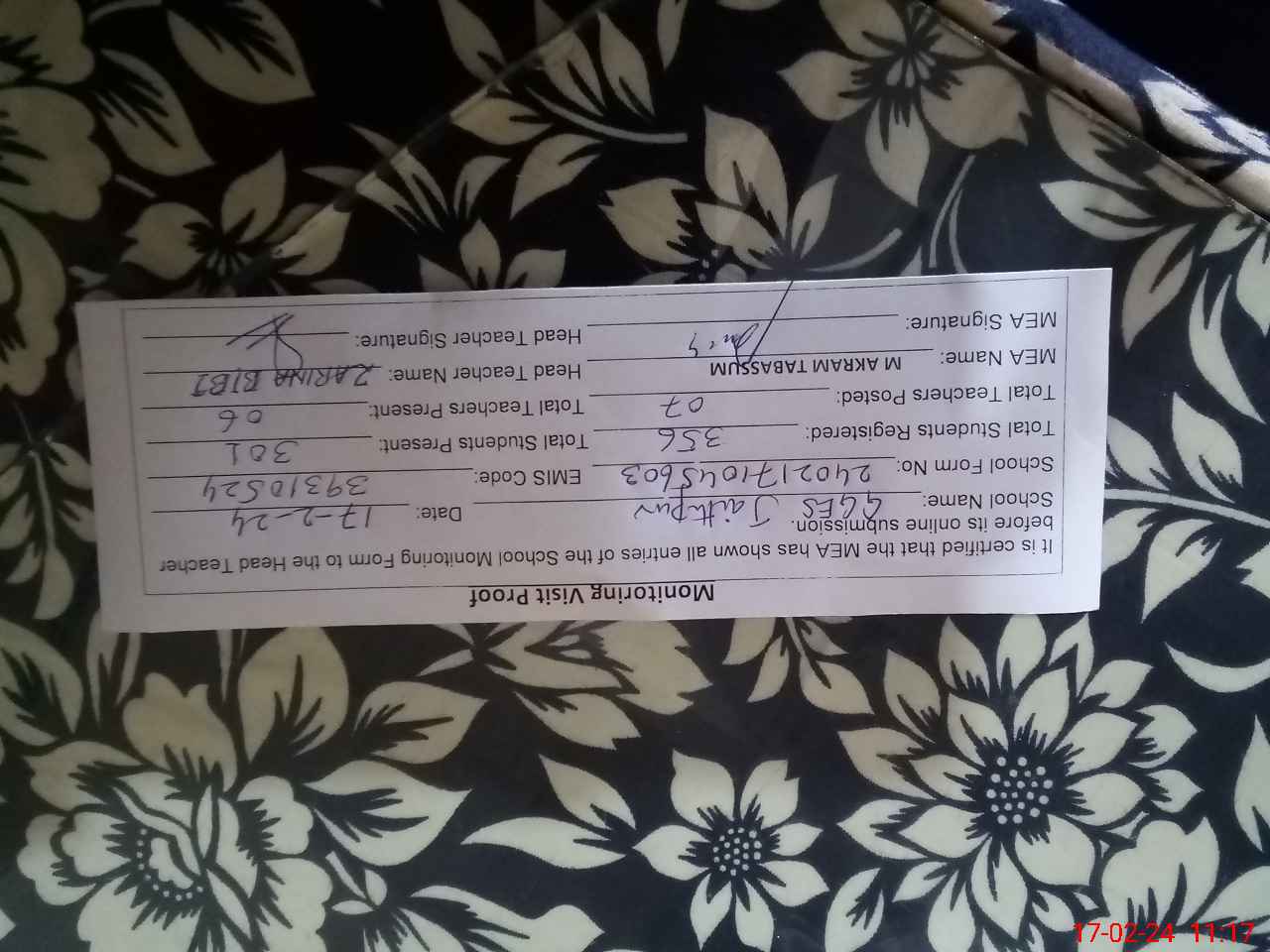 | Attendance Register | Head Teacher | MEA with School | Visit Proof |