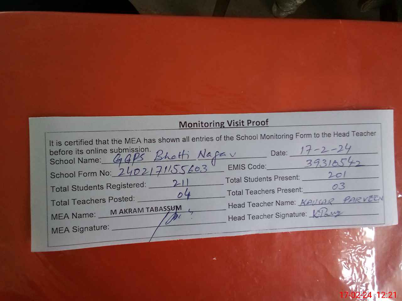 | EMIS Code: 39310542 | Name of School: GGPS BHATTI NAGAR | |||