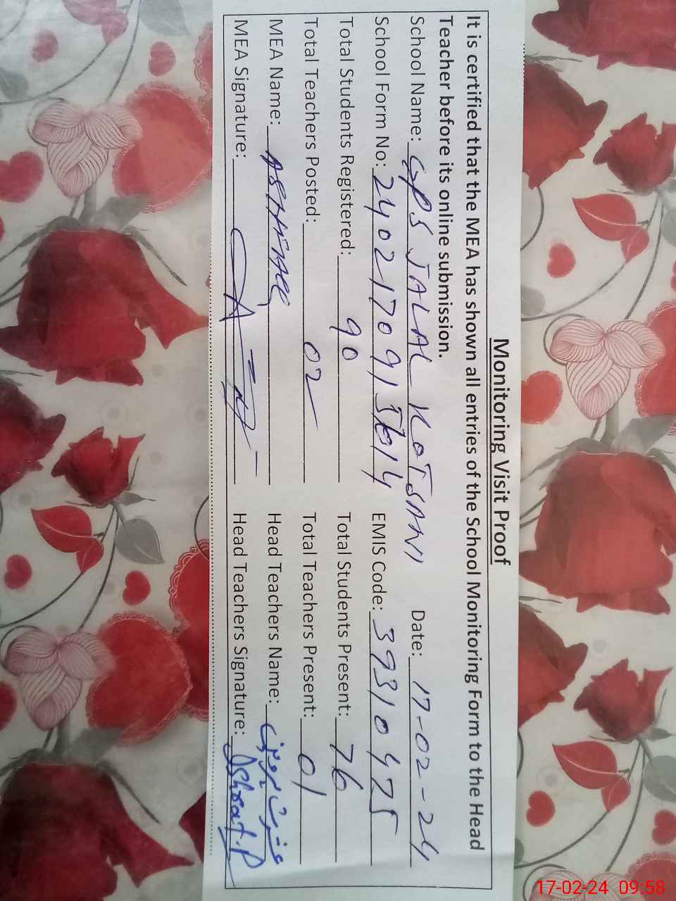| Attendance Register | Head Teacher | MEA with School | Visit Proof |