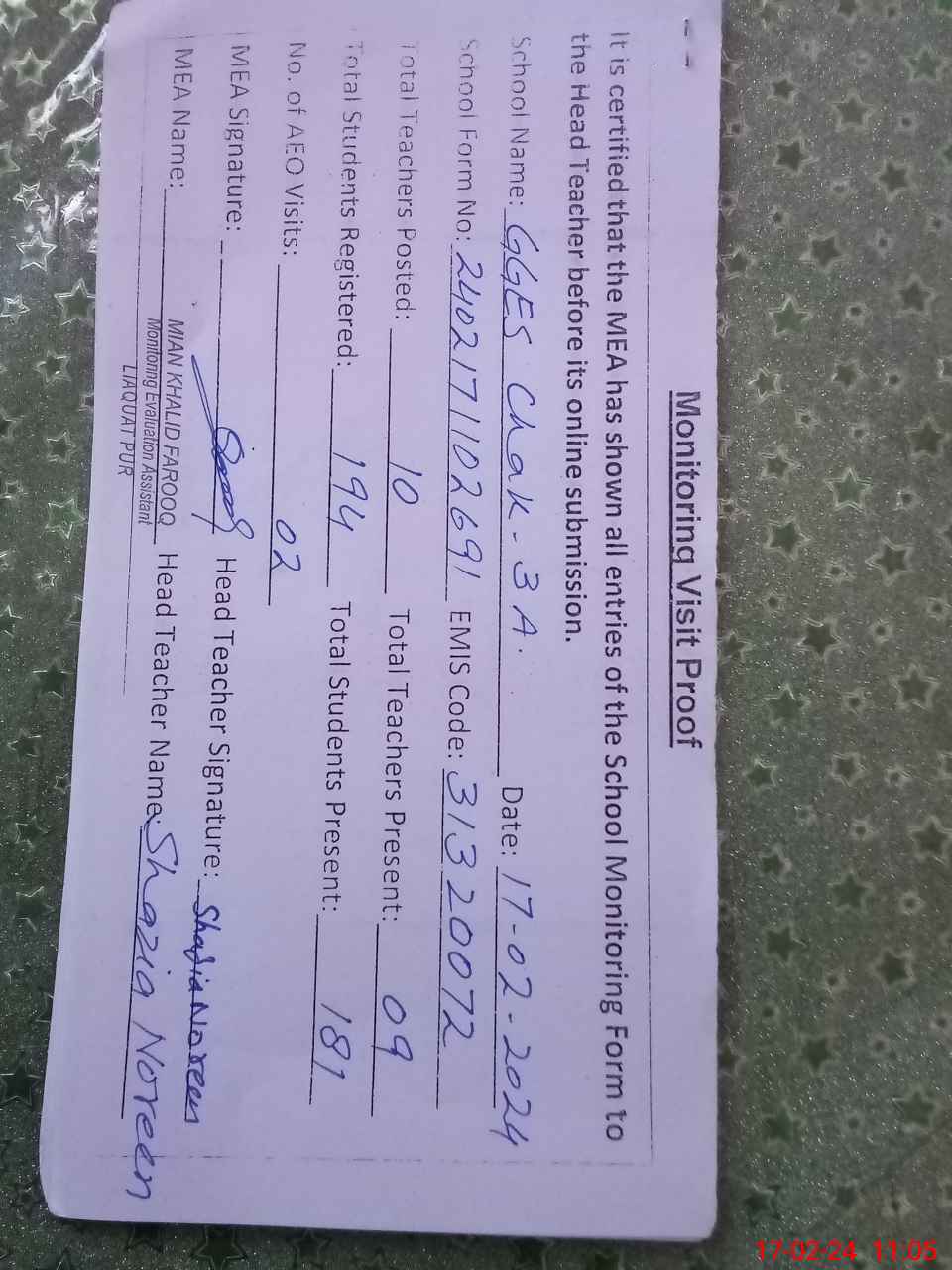 | EMIS Code: 31320072 | Name of School: GGES CHAK NO. 3/A | |||