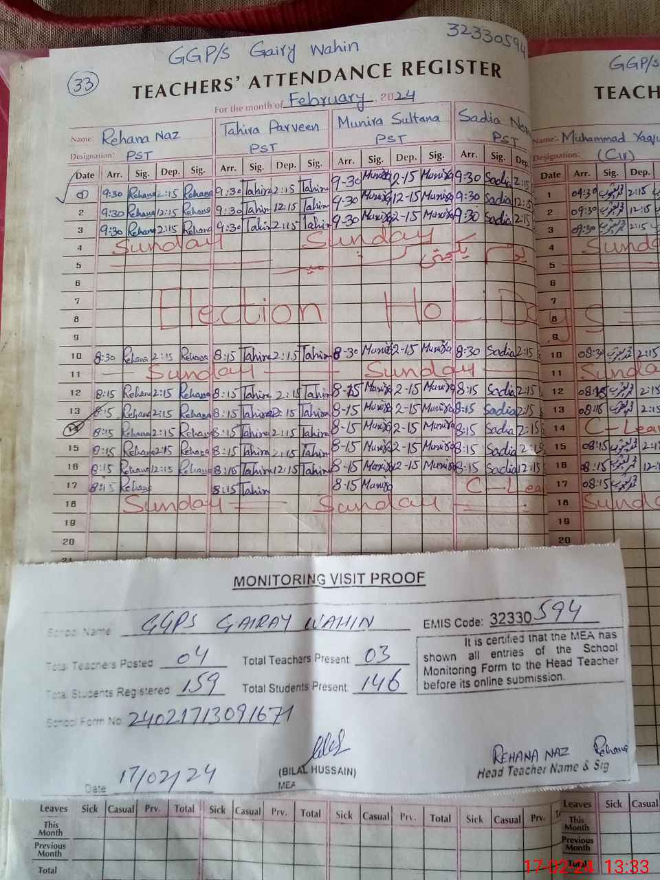 | Attendance Register | Head Teacher | MEA with School | Visit Proof |