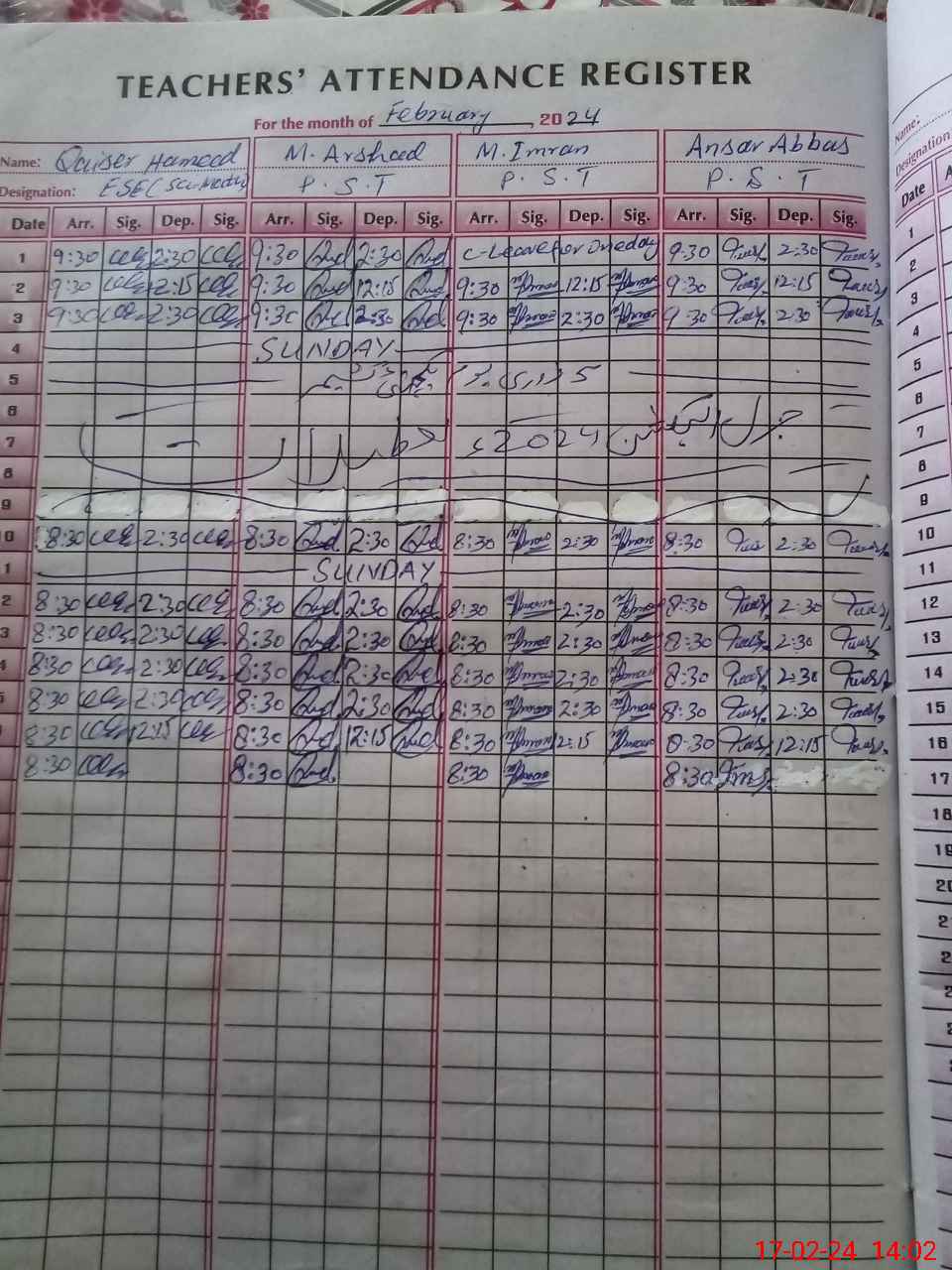 | CNIC | Full Name | Designation | R/C | Absence During Last Calender Month |