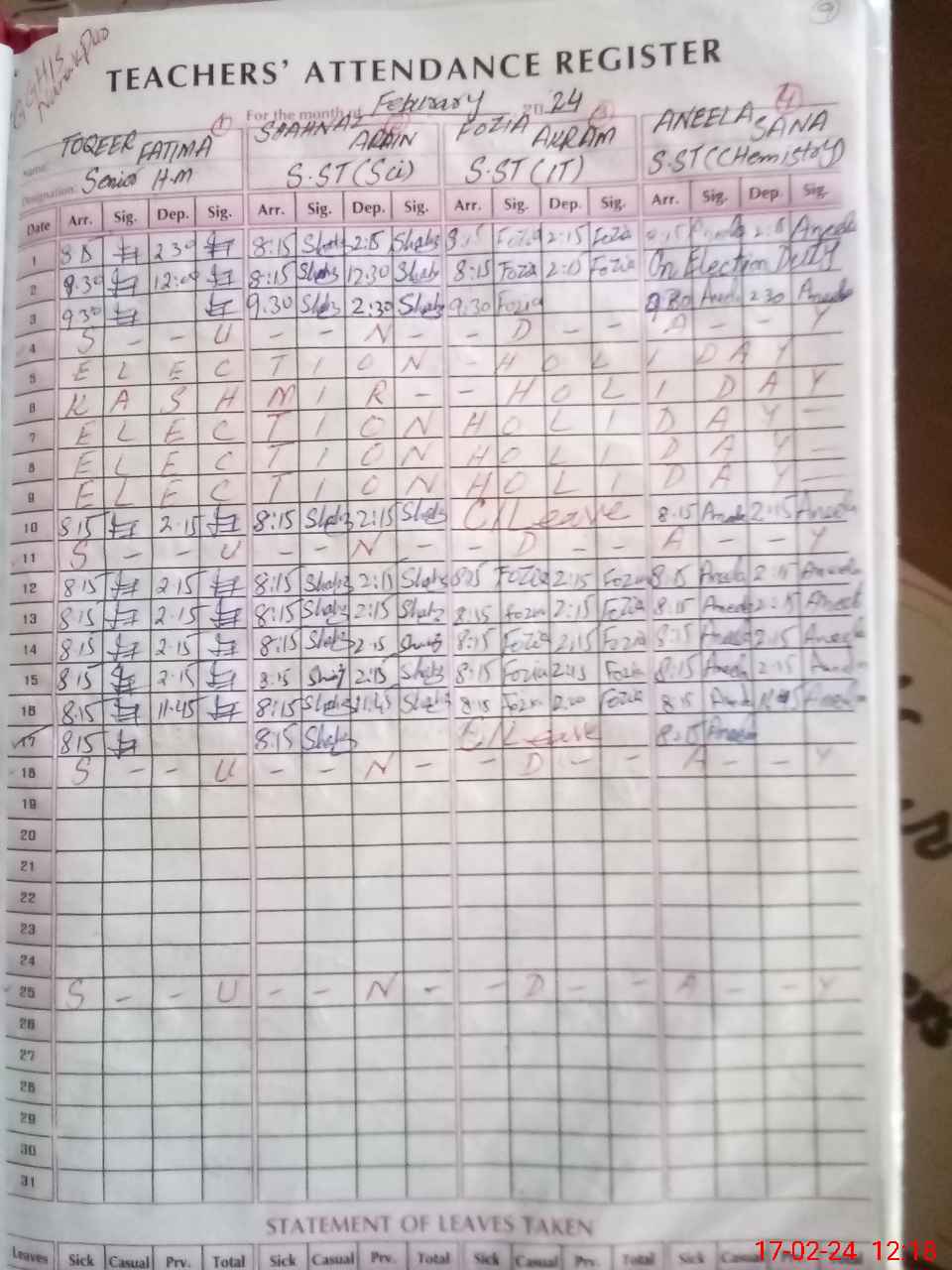 | CNIC | Full Name | Designation | R/C | Absence During Last Calender Month |