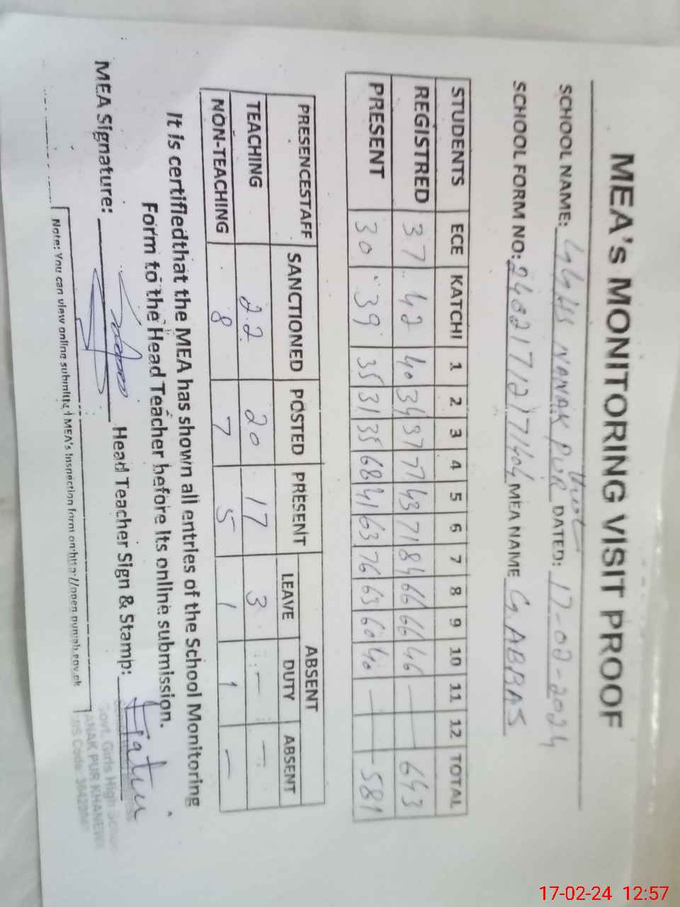 | Attendance Register | Head Teacher | MEA with School | Visit Proof |