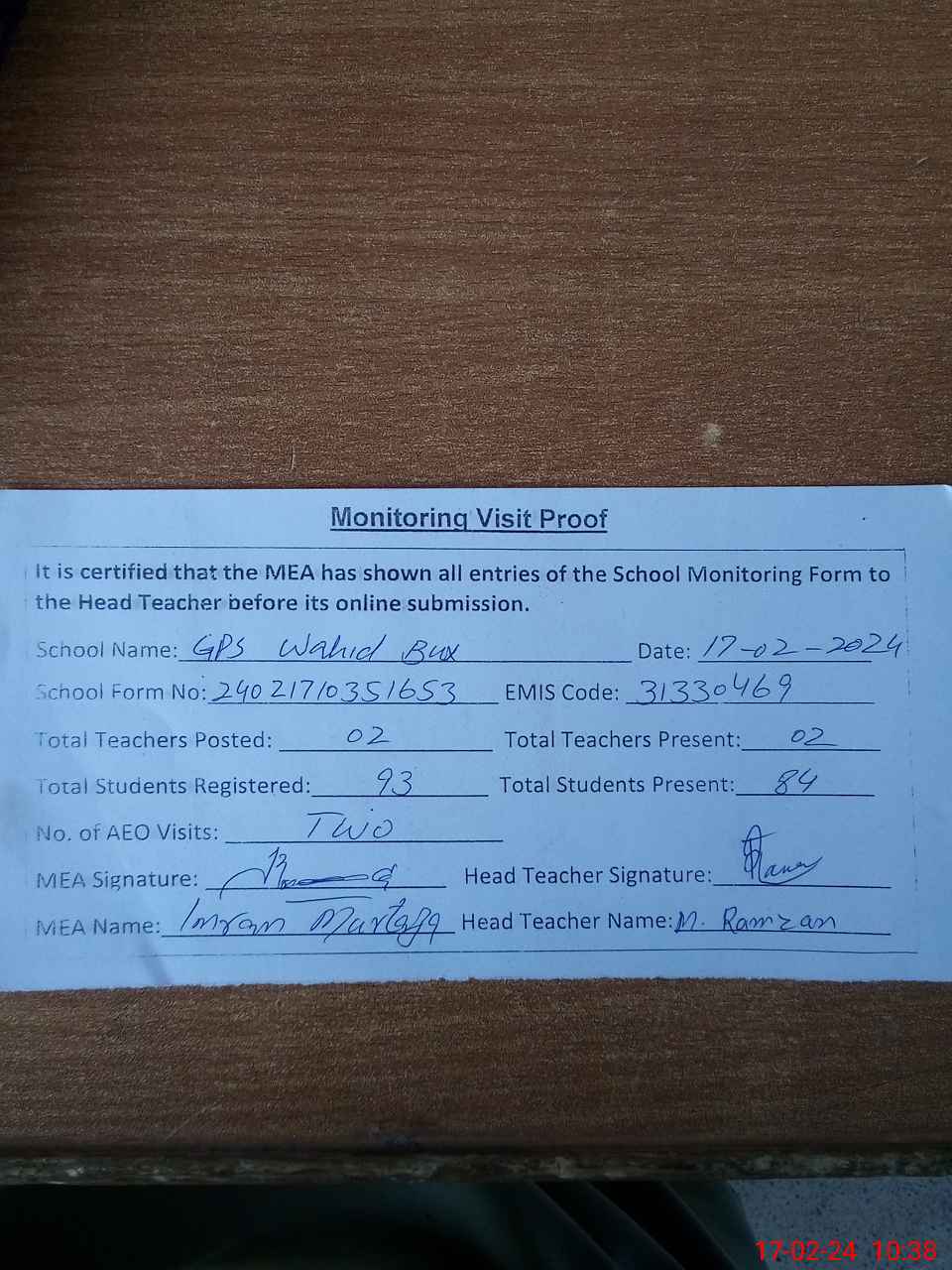 | Attendance Register | Head Teacher | MEA with School | Visit Proof |