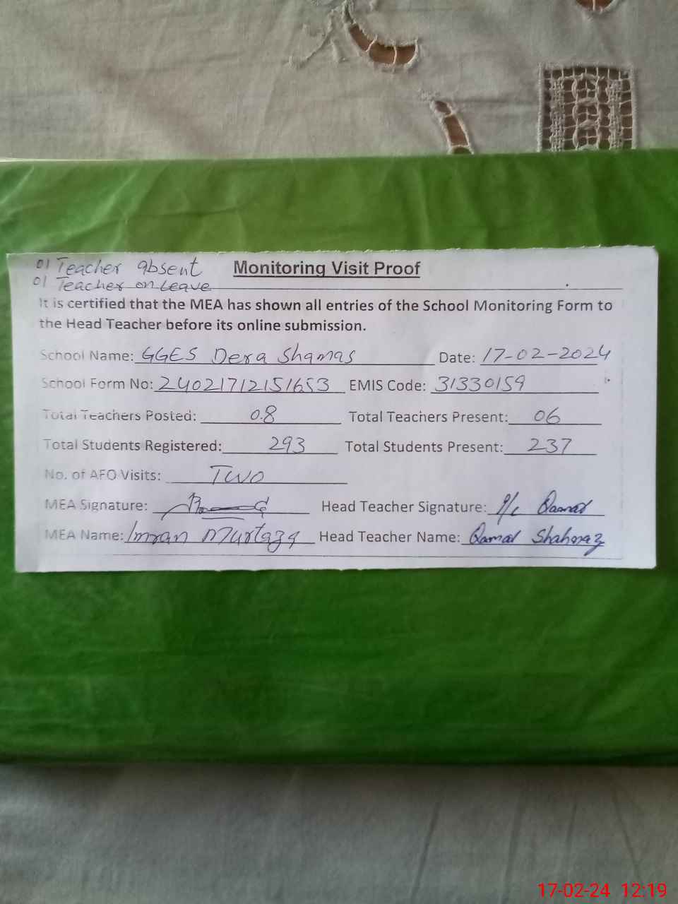 | Attendance Register | Head Teacher | MEA with School | Visit Proof |