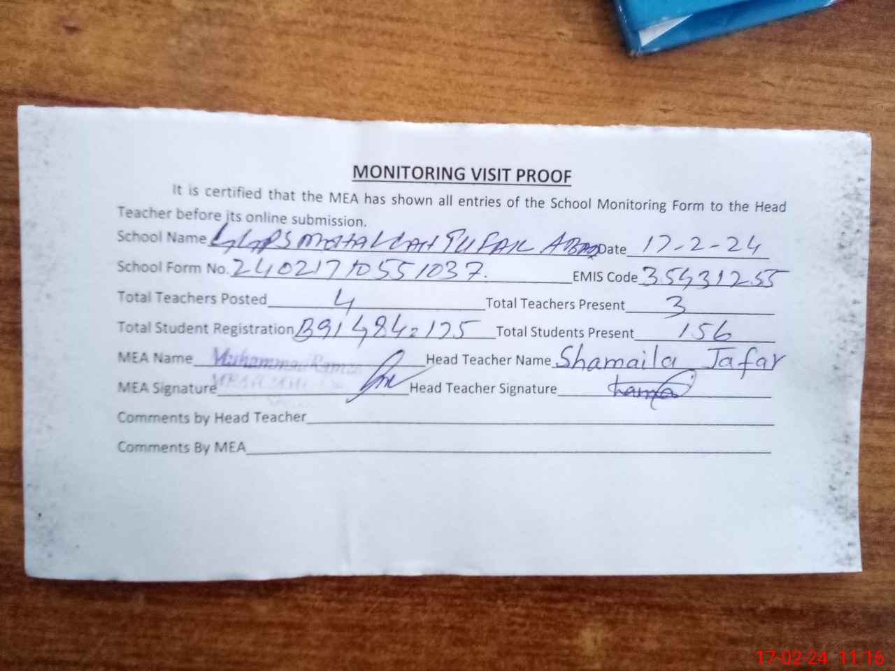 | Attendance Register | Head Teacher | MEA with School | Visit Proof |