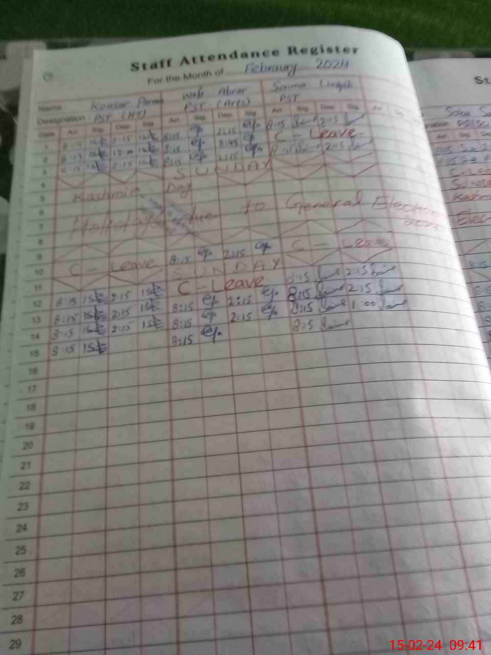 | CNIC | Full Name | Designation | R/C | Absence During Last Calender Month |
