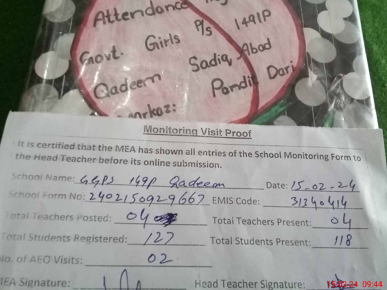 | Attendance Register | Head Teacher | MEA with School | Visit Proof |
