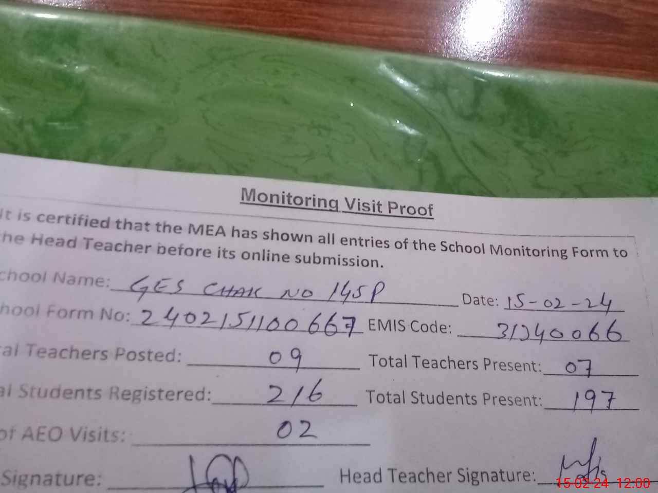 | Attendance Register | Head Teacher | MEA with School | Visit Proof |