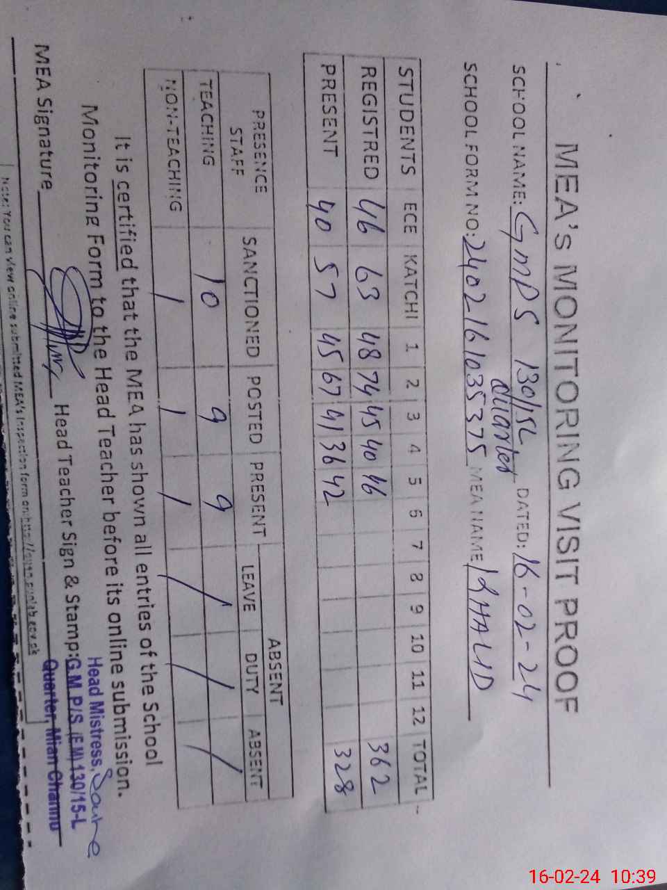 | Certified that this School was Inspected by the Undersigned MEA/DMO Today and the Information Stated Above is as Per Record. | |||||