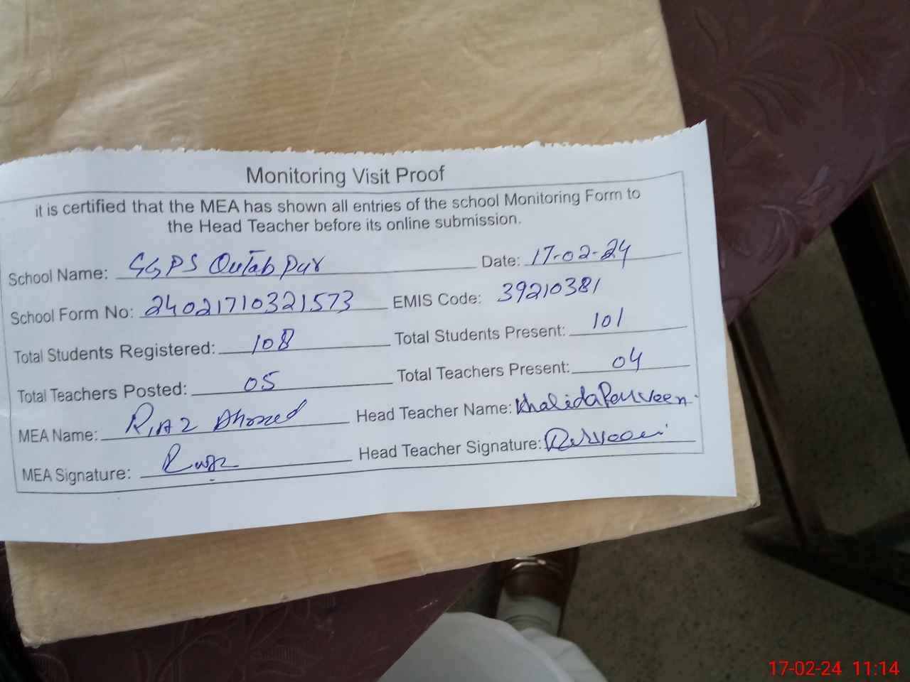 | Attendance Register | Head Teacher | MEA with School | Visit Proof |