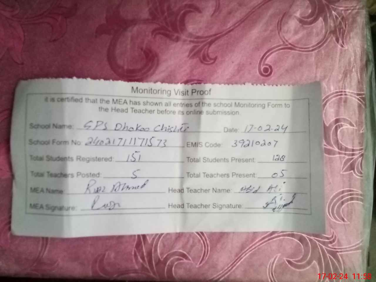 | EMIS Code: 39210207 | Name of School: GPS DHAKOO CHISHTI PO PAKPATTAN | |||