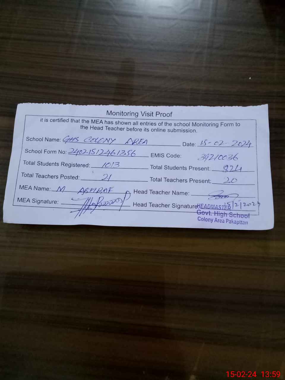 | Attendance Register | Head Teacher | MEA with School | Visit Proof |