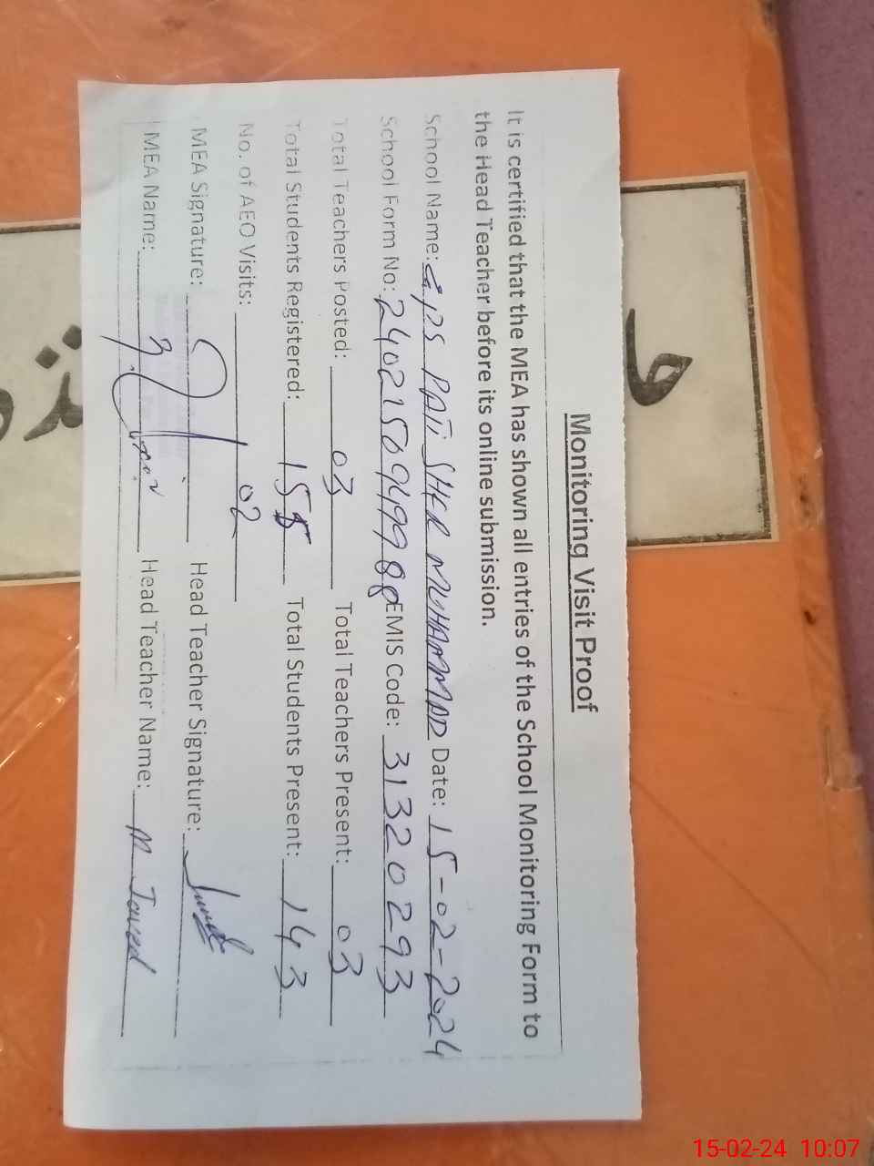 | Attendance Register | Head Teacher | MEA with School | Visit Proof |
