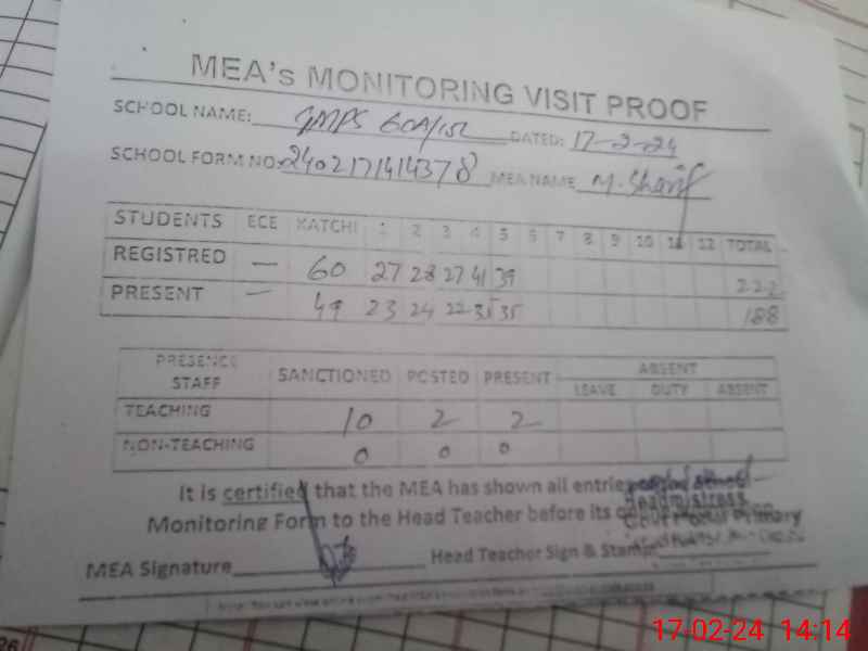 | Attendance Register | Head Teacher | MEA with School | Visit Proof |
