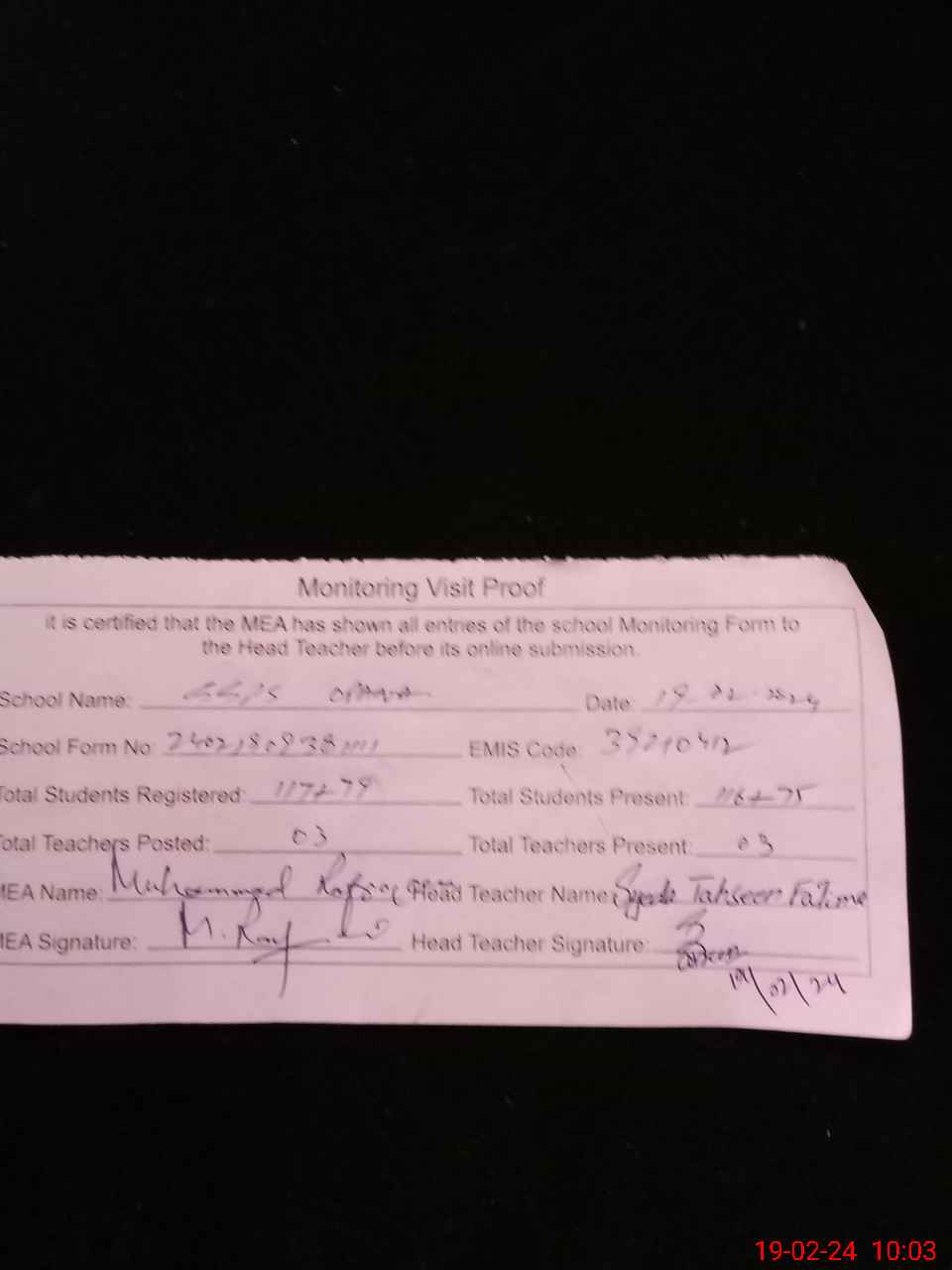 | Certified that this School was Inspected by the Undersigned MEA/DMO Today and the Information Stated Above is as Per Record. | |||||
