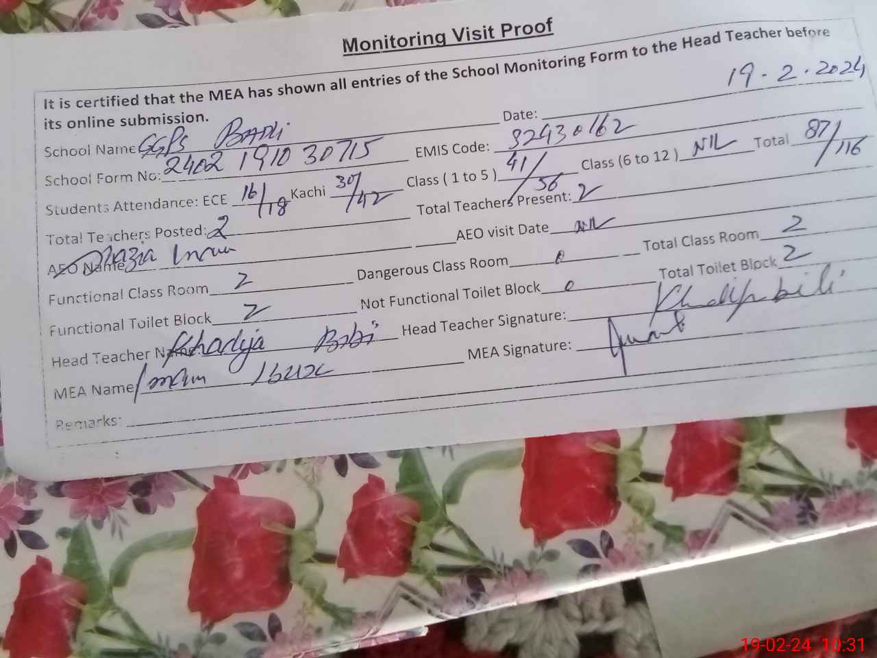 | Certified that this School was Inspected by the Undersigned MEA/DMO Today and the Information Stated Above is as Per Record. | |||||