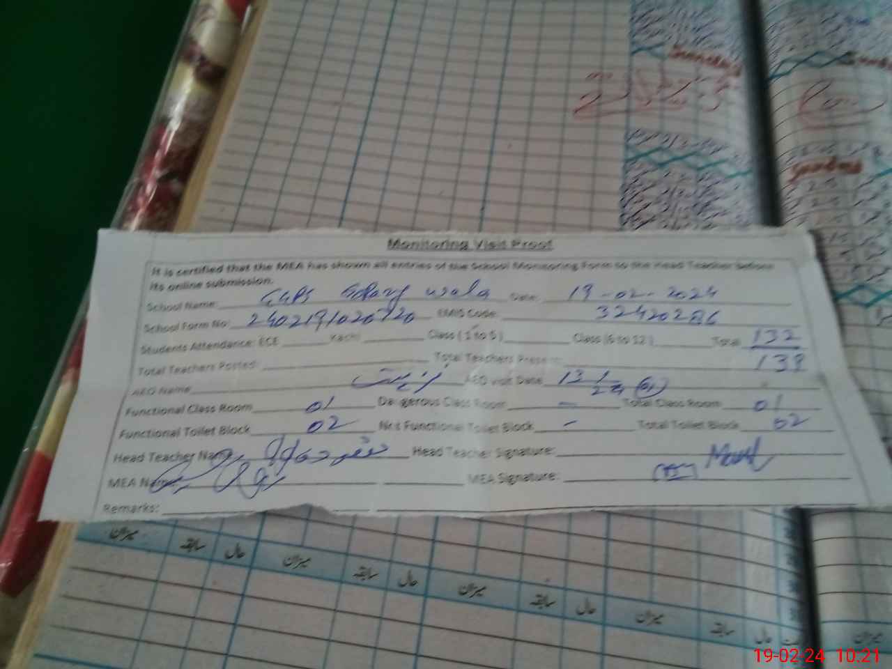 | Attendance Register | Head Teacher | MEA with School | Visit Proof |