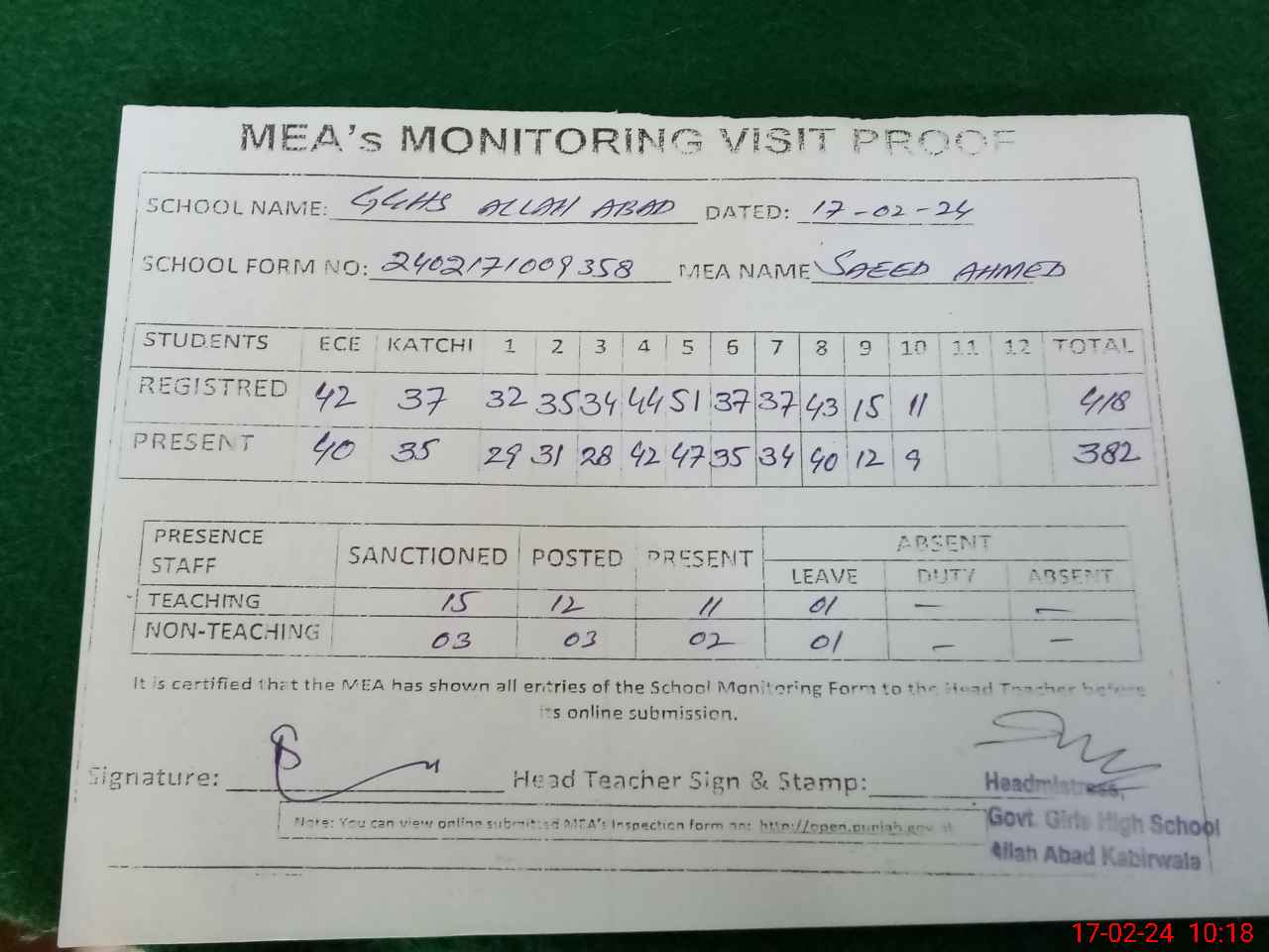 | Attendance Register | Head Teacher | MEA with School | Visit Proof |