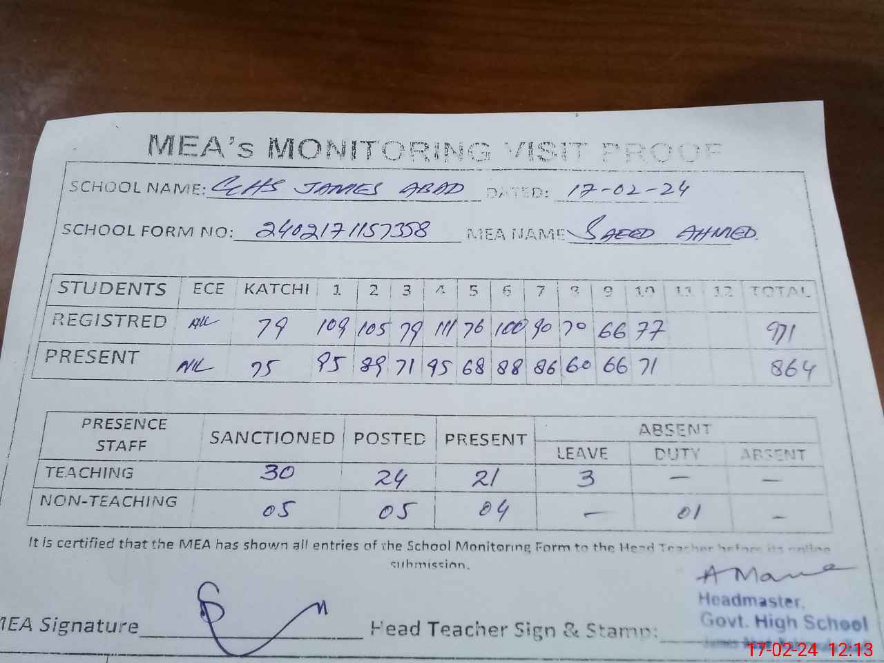 | Attendance Register | Head Teacher | MEA with School | Visit Proof |