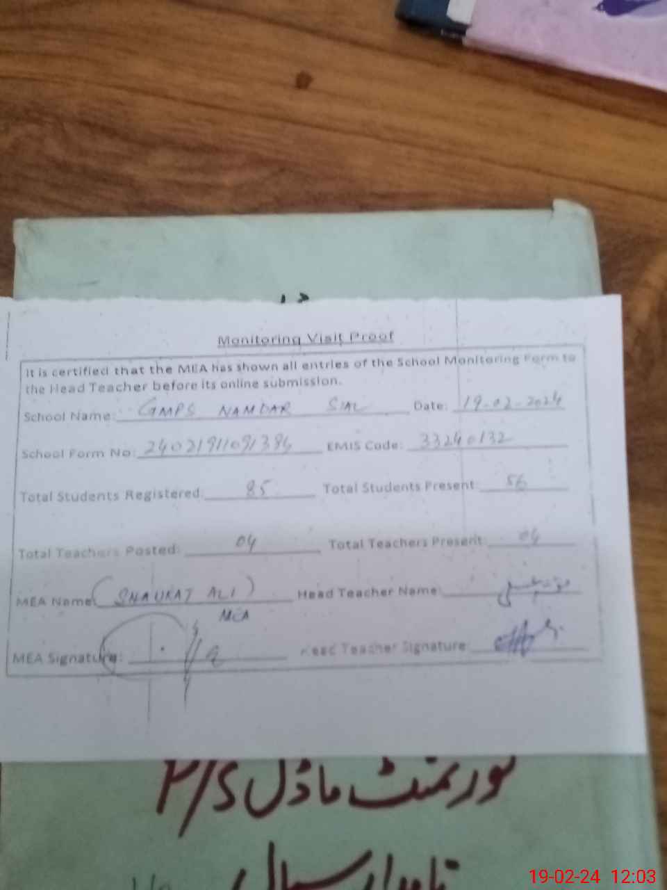 | EMIS Code: 33240132 | Name of School: GMPS NAMDAR SIAL | |||