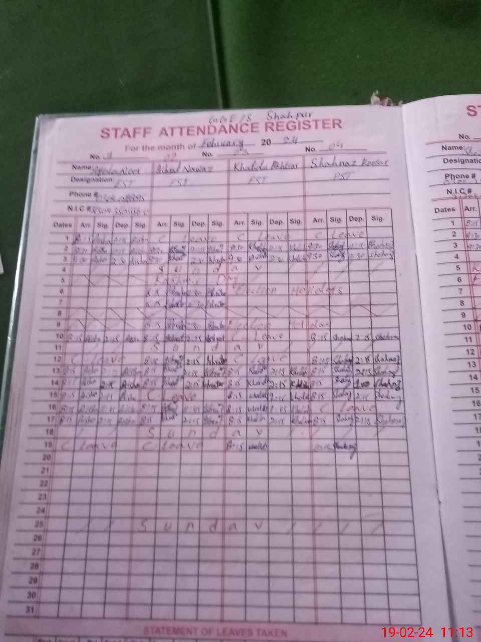 | CNIC | Full Name | Designation | R/C | Absence During Last Calender Month |