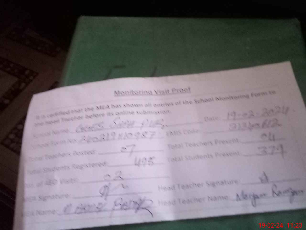 | Attendance Register | Head Teacher | MEA with School | Visit Proof |
