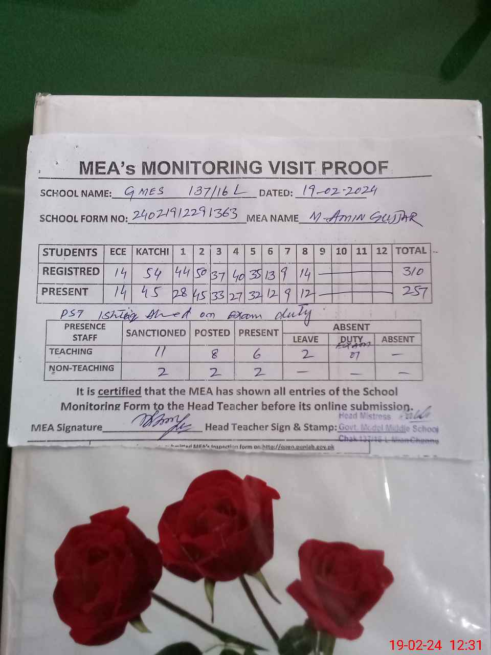 | Attendance Register | Head Teacher | MEA with School | Visit Proof |