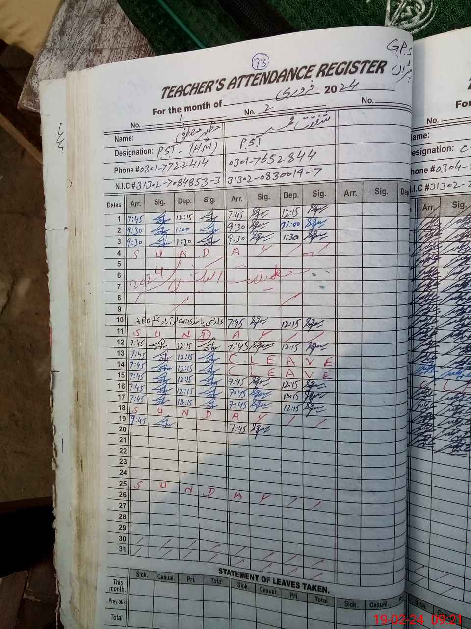 | Name: MA**** MU**** Designation: (School Headmaster's/Headmistress's) PST Phone/Cell Number: 03**** |