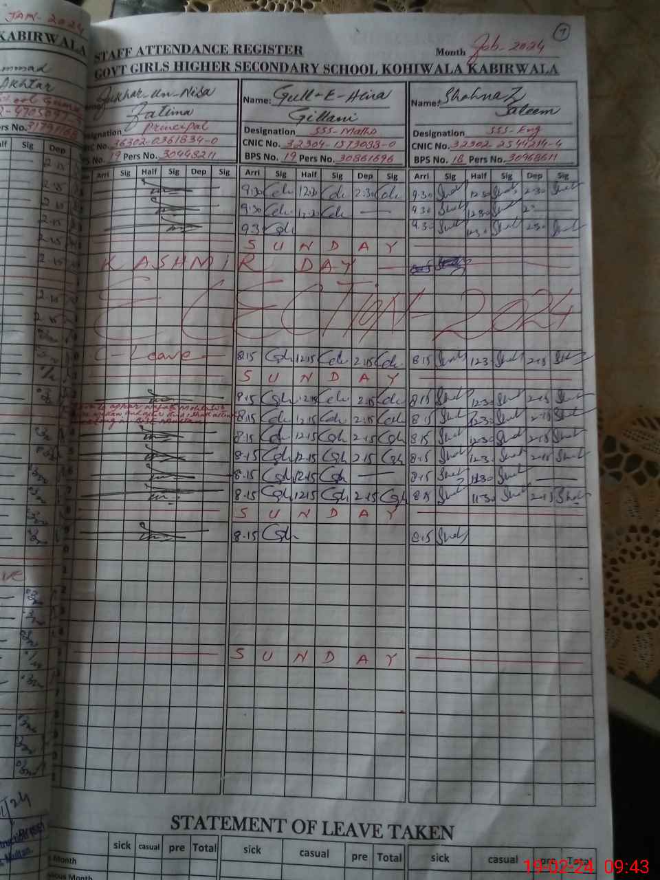 | CNIC | Full Name | Designation | R/C | Absence during last cal. month |