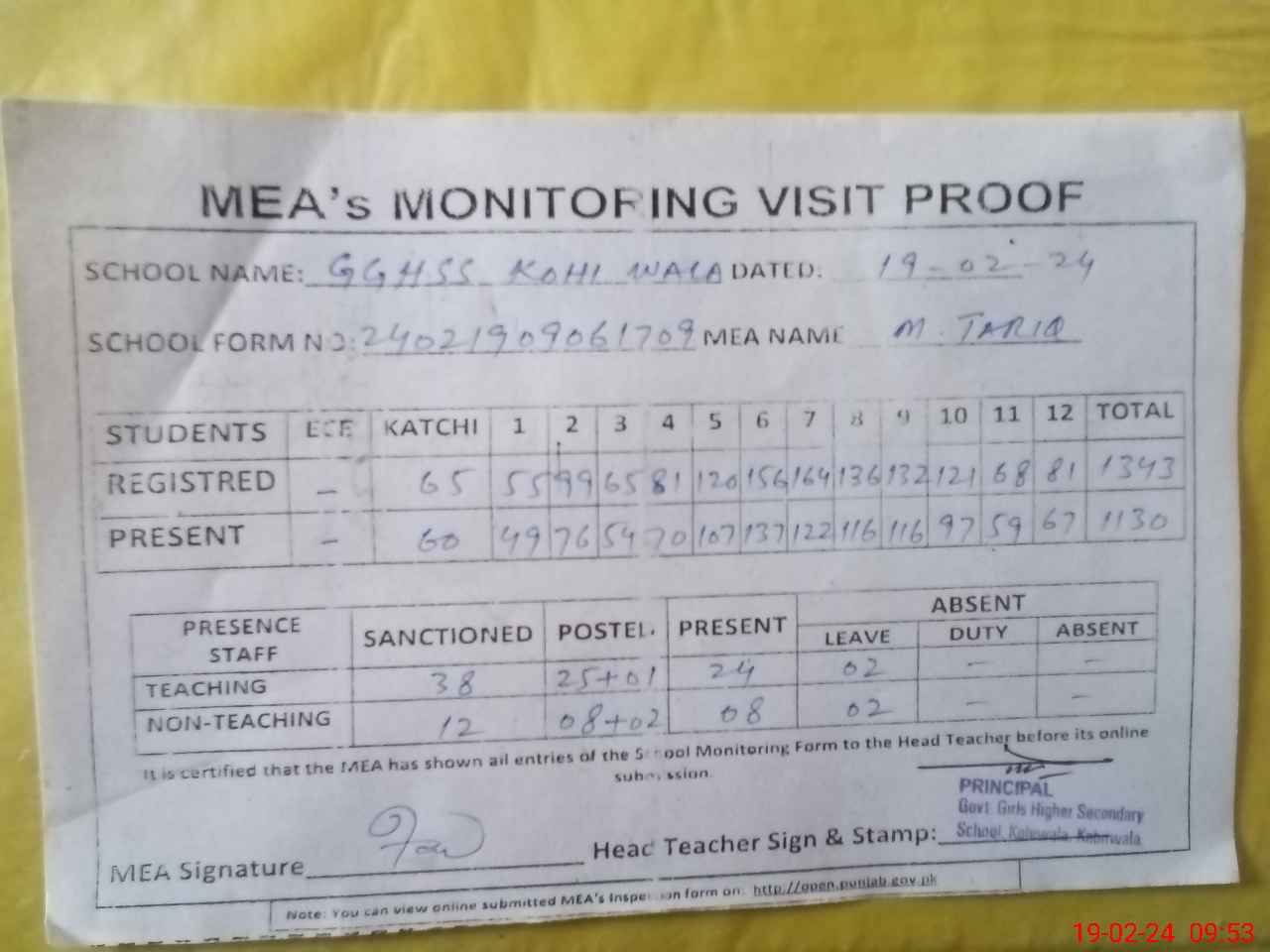 | Attendance Register | Head Teacher | MEA with School | Visit Proof |