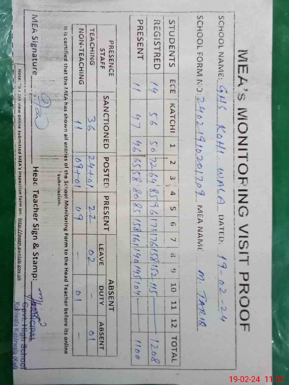 | EMIS Code: 36410006 | Name of School: GHS KOHI WALA, KABIRWALA | |||