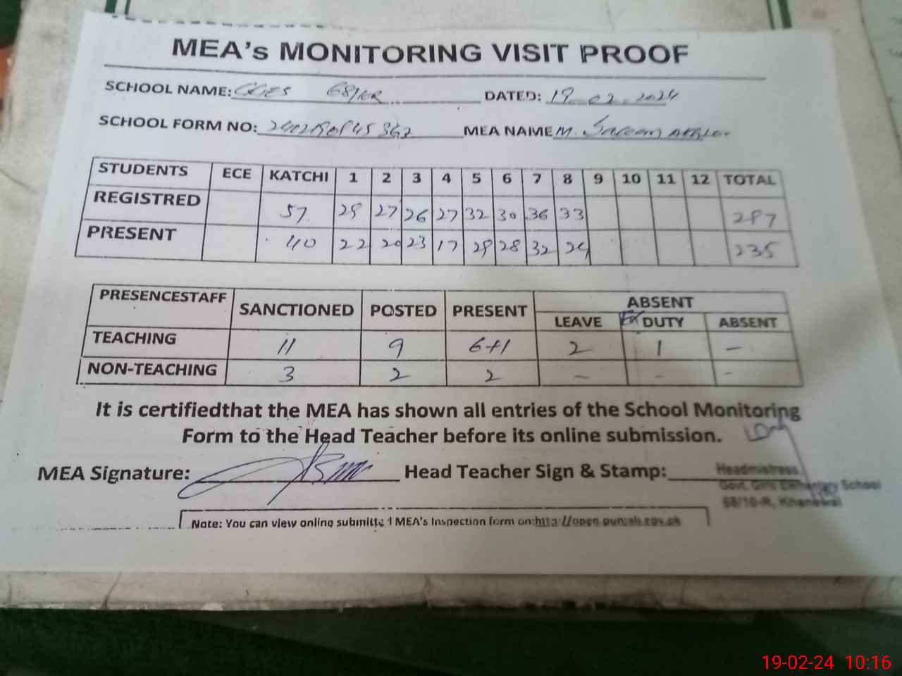 | Certified that this School was Inspected by the Undersigned MEA/DMO Today and the Information Stated Above is as Per Record. | |||||